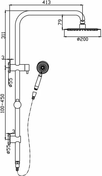 The round stainless steel rain showerhead provides a comfortable distance from wall of 513mm